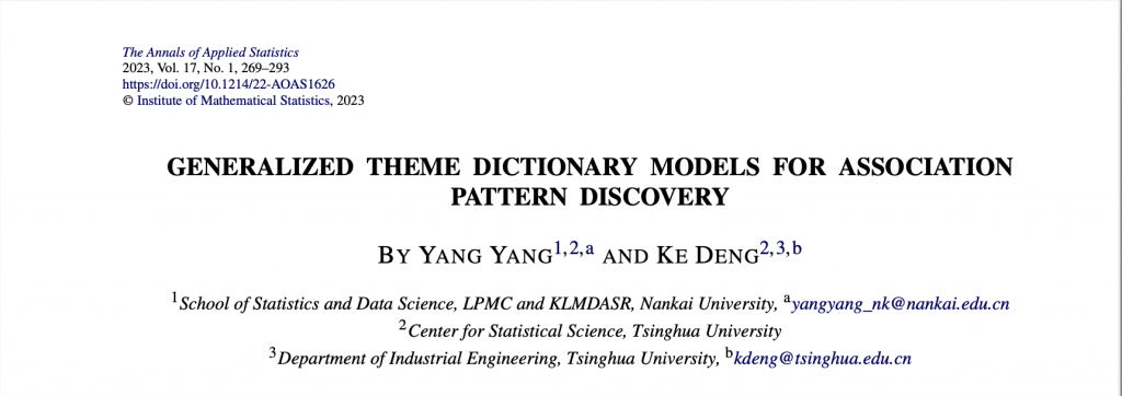 统计学研究中心邓柯副教授课题组在应用统计知名期刊The Annals of Applied Statistics (AOAS)发表题为“Generalized theme dictionary models for association pattern discovery”的研究论文,提出了挖掘关联性规则的新方法。南开大学统计与数据科学学院杨洋特聘副研究员(课题组2015级博士生)为论文的第一作者,邓柯副教授为论文的通讯作者。