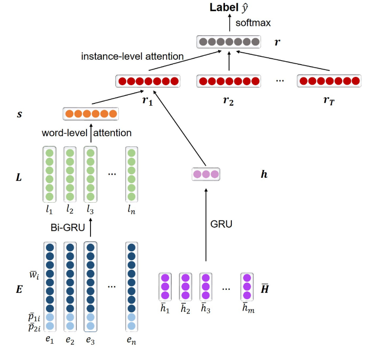 该论文通过开源医学知识网站与维基百科中医学文章作为医学文本库,扩展了关系提取的数据收集机制,从文本库中进行训练数据的采集与自动标注,并进行了多轮的数据清洗,提升样本的自动标注质量与信号强度。在模型中,论文选用含Attention机制的双向Bi-GRU模型,并加入了文章章节结构信息,并使用GRU进行自动编码,最后将同一个概念-关系三元组所对应的所有训练语句进行加权后输出。