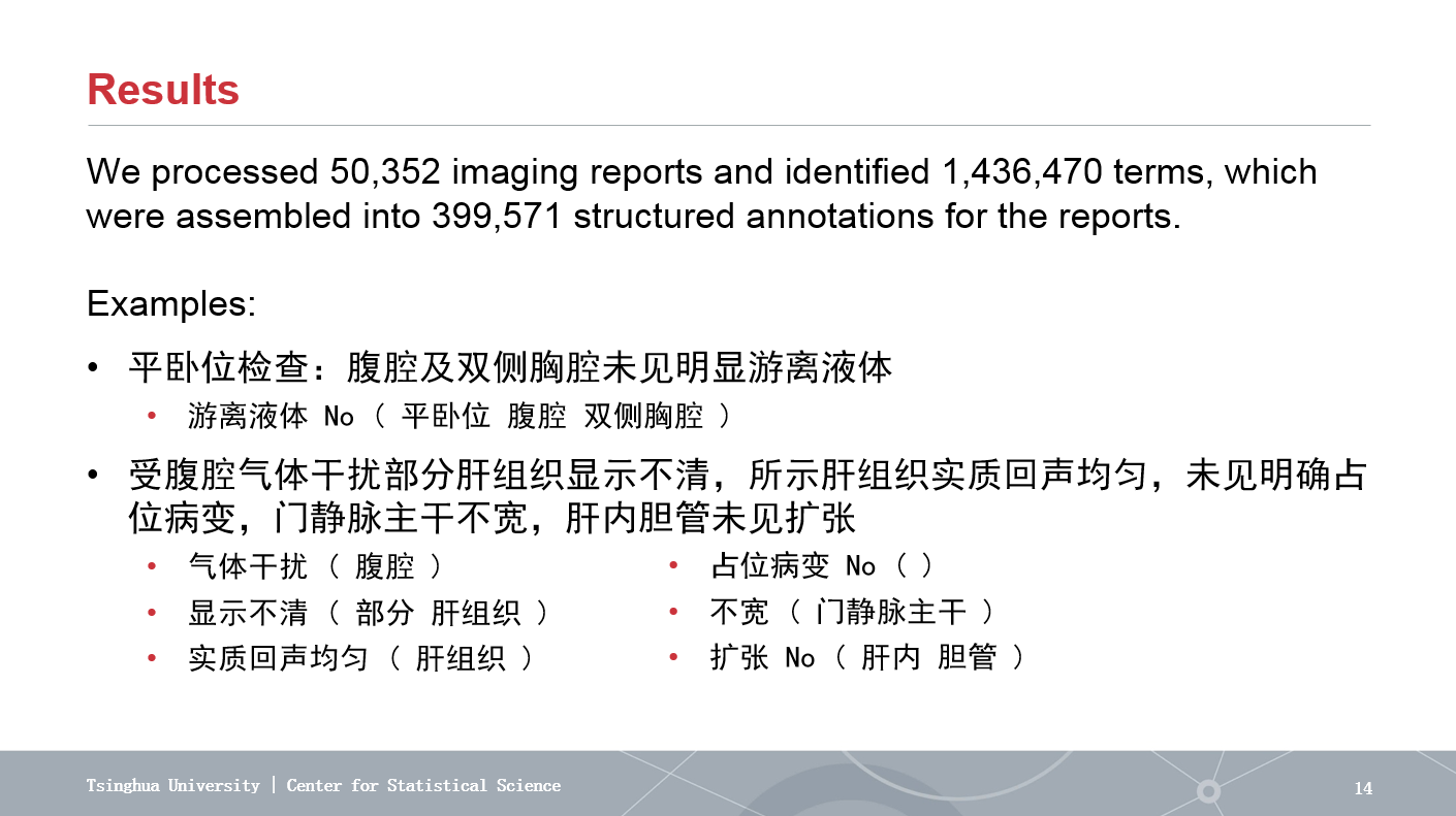 本次比赛,由13个跨学科团队的近两百人参加。比赛是基于解放军总医院急救数据库,在2天时间内以团队为单位进行头脑风暴,提出并解决具有临床应用价值的问题。俞声教授团队本次挑战的内容是医学影像报告的自动分析并生成结构化标注,利用原创的基于图论的方法分析文本,在不使用医学词典和人工标注的条件下实现了医学术语的自动发现与语意分析。成果为促进医疗文本的有效利用和进一步的医疗领域数据科学研究提供了技术基础。
