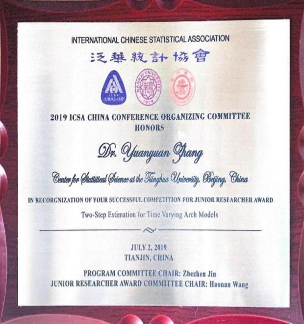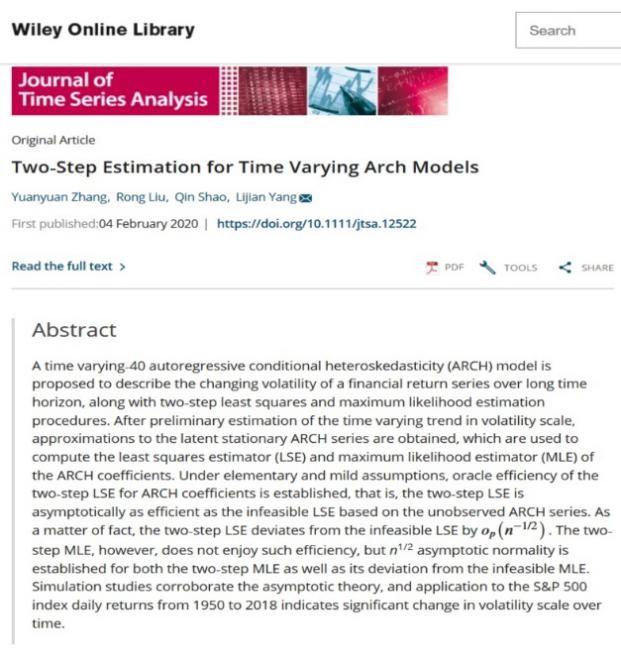 2020年2月4日,张园园作为第一作者完成的另一学术论文“Two-step estimation for time varying ARCH models”在线发表于统计学SCI期刊Journal of Time Series Analysis(//doi.org/10.1111/jtsa.12522 )。这篇与托雷多大学终身教授刘嵘,邵琴合作的19页重磅论文+27页在线补充材料,从理论上严格证明了对于带有时间缓变尺度的非平稳ARCH时间序列,用去除样条函数估计的尺度趋势之后的ARCH残差序列,计算ARCH系数的最小二乘估计LSE与直接用观测不到的平稳ARCH序列计算有相同的渐近正态分布。另一方面,以残差序列计算的极大似然估计MLE的渐近正态分布则不同于以观测不到的平稳ARCH序列计算的MLE。该文提出的方法被用于估计标准普尔(S&P)500从1950到2018年每日回报率的时间缓变尺度以及隐藏的ARCH参数,清楚地揭示了金融波动率水平随时间的长期缓慢增长,特别是2008年全球金融危机前后波动率尺度的大幅增长。该文在2019年7月荣获国际泛华统计协会(International Chinese Statistical Association)颁发的中国会议青年研究者奖(ICSA China Conference Junior Researcher Award),是4位获奖者中唯一的学生,也是唯一不是来自美国高校的获奖者。