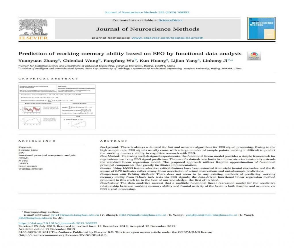 机械工程系季林红教授为通讯作者的论文“Prediction of working memory ability based on EEG by functional data analysis”正式发表在神经科学SCI期刊 Journal of Neuroscience Methods第333卷(//doi.org/10.1016/j.jneumeth.2019.108552, 333)。该文首次建立了以脑电信号预测工作记忆能力的多重函数型线性模型。由于使用样条函数,该模型直观易懂,计算快捷简便,理论性质可靠,基于随机抽取的122名大学生志愿者训练集,以闭眼静息态下,8个脑前区导联的脑电信号,对20名志愿者测试集进行工作记忆能力的预测,其确定系数R2在多次随机试验下的中位数为68%,最低值大于50%,最高值72%。