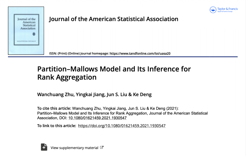 近日,我中心邓柯副教授课题组在统计国际顶尖期刊 Journal of the American Statistical Association (JASA)发表题为“Partition-Mallows Model and Its Inference for Rank Aggregation”的研究论文,提出了一种推断排名聚合的新方法。曾在邓柯课题组工作的朱万闯博士是该文的第一作者,姜瑛恺博士和刘军教授为共同作者,邓柯副教授是论文的通讯作者。