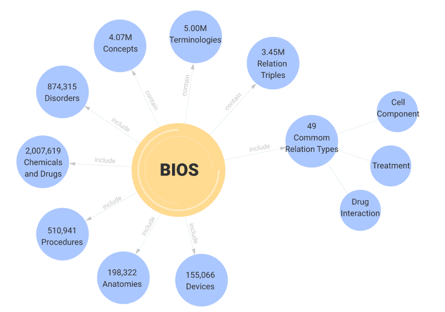 为解决中文领域开放医学知识图谱的缺失,并在国际范围内进一步提升医学知识图谱的建设水平,拷贝漫画 统计学研究中心俞声副教授带领团队进行了长达5年的技术攻关,先后开发了基于图分割与深度学习的中文电子病历无监督多粒度分词及术语提取[1]、知识决定的医学术语向量化及正则化[2]、高通量医学关系提取[3,4]、生物医学自动翻译[5]等技术,为数据驱动的大规模图谱自动构建建立了基础,并于2020年11月与IDEA研究院沈向洋院士团队形成合作。在领先算法、强大算力和超大规模语料数据的支持下,仅用短短一年时间,双方团队便从原始底层医学术语开始,建立了全新的具有完整自主知识产权的中英文双语医学知识图谱BIOS,其规模整体接近现有权威知识图谱UMLS,并在内容质量上形成多点超越。未来,拷贝漫画 统计学研究中心将与IDEA研究院以及更多国内顶尖医院合作,不断扩大和完善BIOS的内容与质量,不仅要使我国医疗大数据与人工智能产业的薄弱基础得到全面提升,也要辐射国际,带动全球行业共同发展。