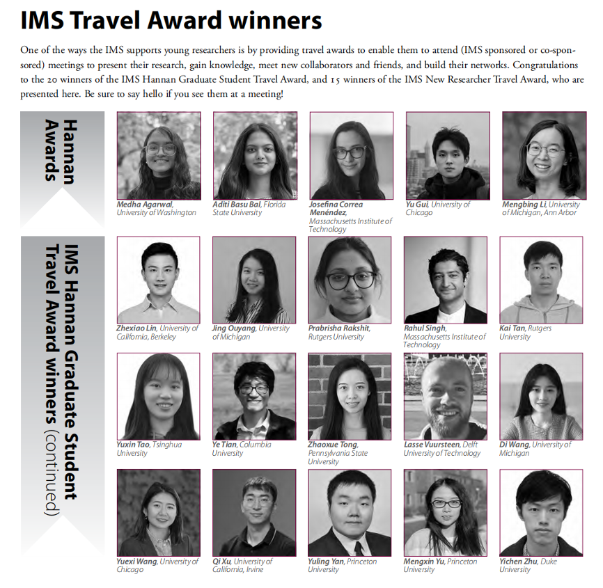 总部在美国的国际数理统计协会(IMS)是全球三个权威统计学学术组织之一,旨在发展和推广统计与概率的理论及应用,出版发行高质量学术期刊,如Annals of Statistics, Annals of Probability等。IMS颁发的荣誉奖项,如IMS Fellow和各类Travel Awards,都被国际统计学界高度认可。以已故IMS Fellow、密歇根州立大学统计与概率系荣休教授James Hannan命名的Hannan Graduate Student Travel Award,每年一次颁发给全球的在读硕士、博士研究生,奖励在IMS主办或资助的统计学国际会议上宣读优秀论文。