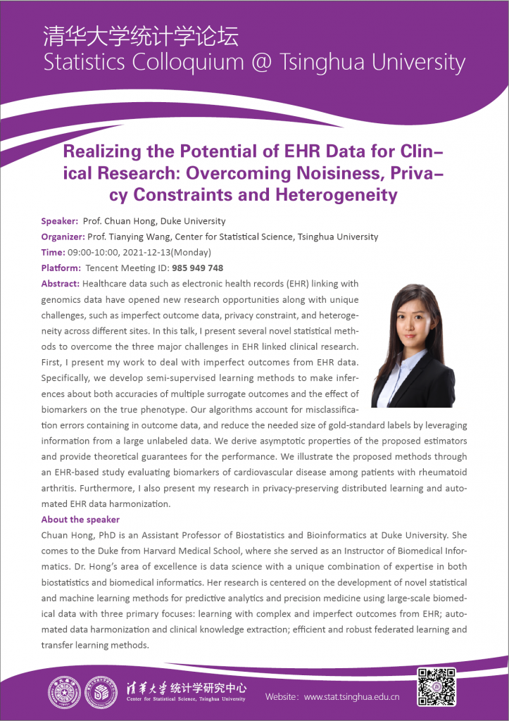 【统计学论坛】Realizing the Potential of EHR Data for Clinical Research: Overcoming Noisiness, Privacy Constraints and Heterogeneity