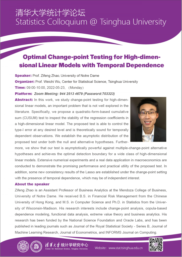 【统计学论坛】Optimal Change-point Testing for High-dimensional Linear Models with Temporal Dependence