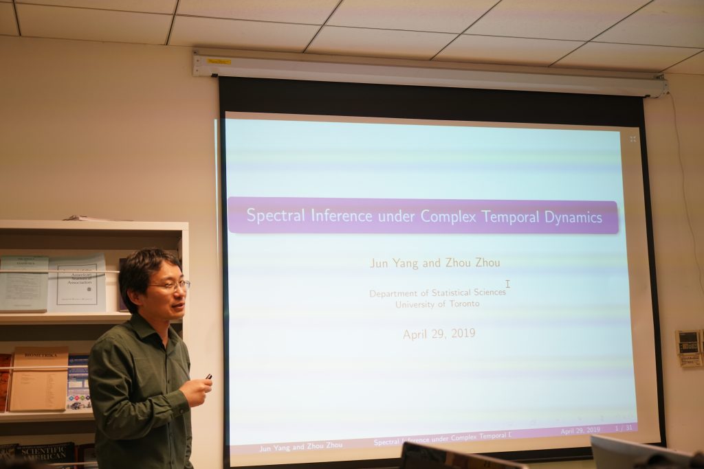 2019年4月29日,多伦多大学统计系的周舟副教授访问我中心,并做学术报告,报告的题目是Spectral Inference under Complex Temporal Dynamics。
