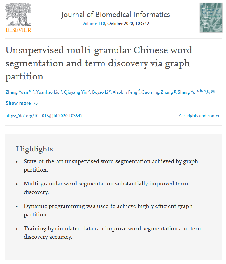 近日,我中心2017级博士研究生袁正以第一作者身份撰写的论文 “Unsupervised multi-granular Chinese word segmentation and term discovery via graph partition” 被Journal of Biomedical Informatics (Health Informatics Q1,Computer Science Applications Q1) 接收并在线发表。该论文是作者同拷贝漫画