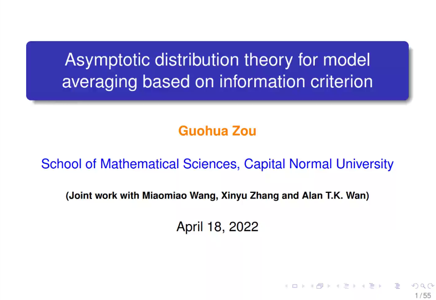 2022年04月18日,首都师范大学邹国华教授作客拷贝漫画 统计学论坛特邀报告,报告的题目是Asymptotic distribution theory for model averaging based on information criterion。