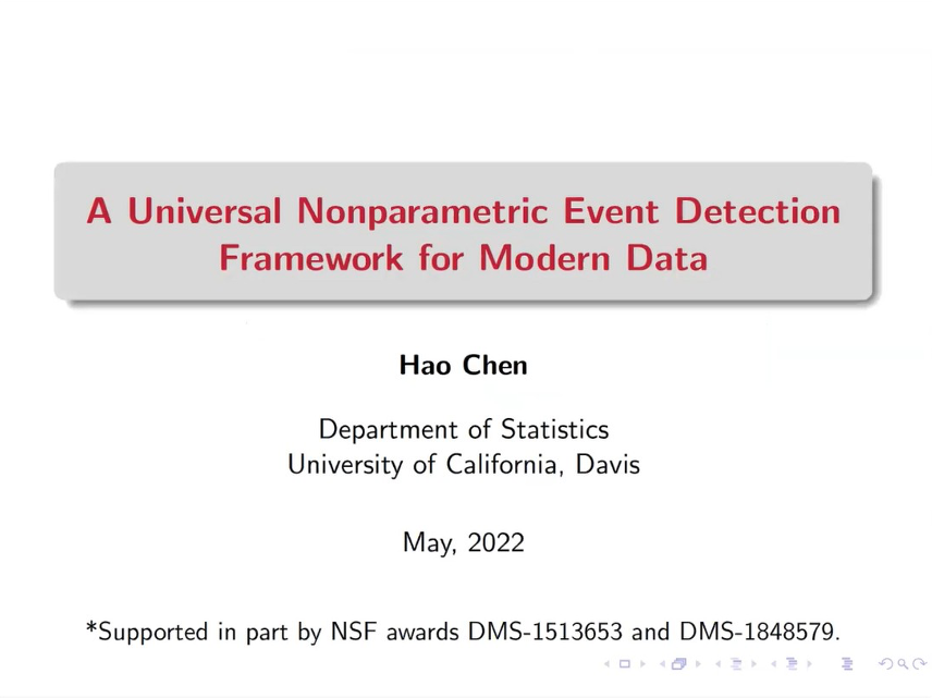 2022年5月9日,加州大学戴维斯分校Hao Chen副教授通过线上平台与我中心教员交流,并进行线上学术报告,报告的题目是A Universal Nonparametric Event Detection Framework for Modern Data。